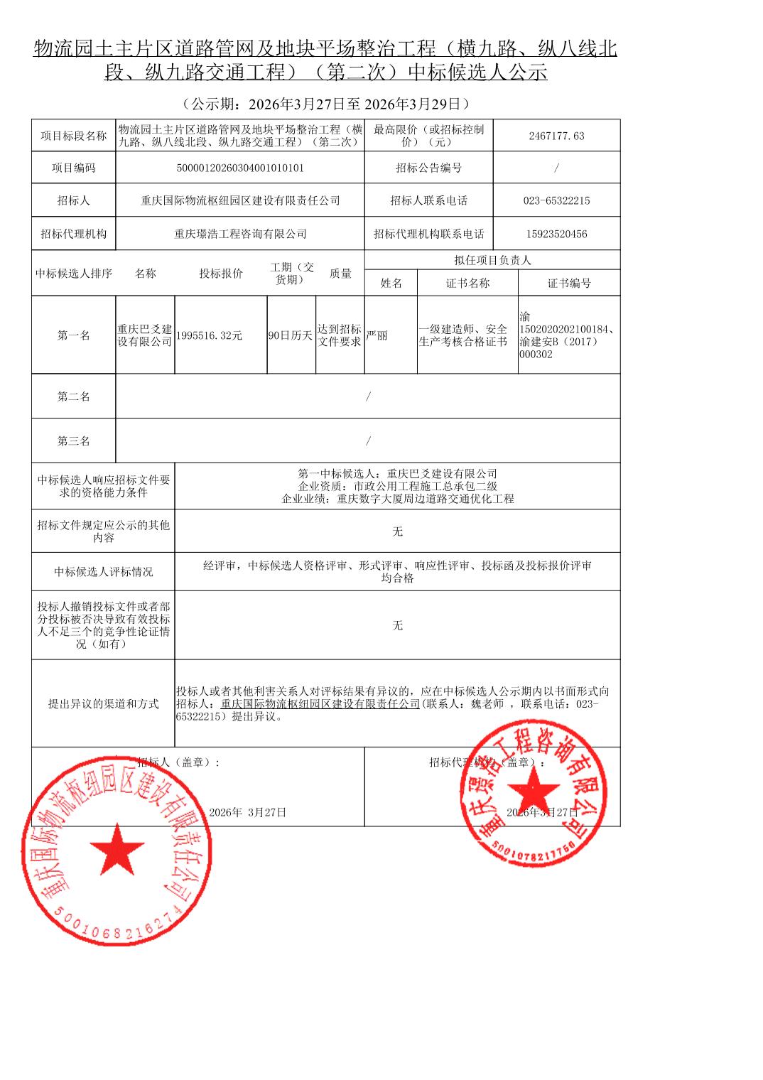 | 名称: | 物流园土主片区道路管网及地块平场整治工程(横九路、纵八线北段、纵九路交通工程)(第二次)中标候选人公示 | ||||