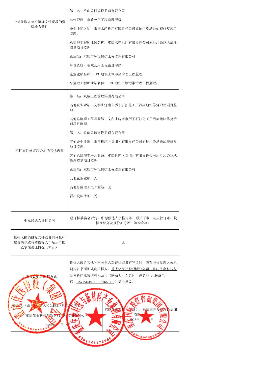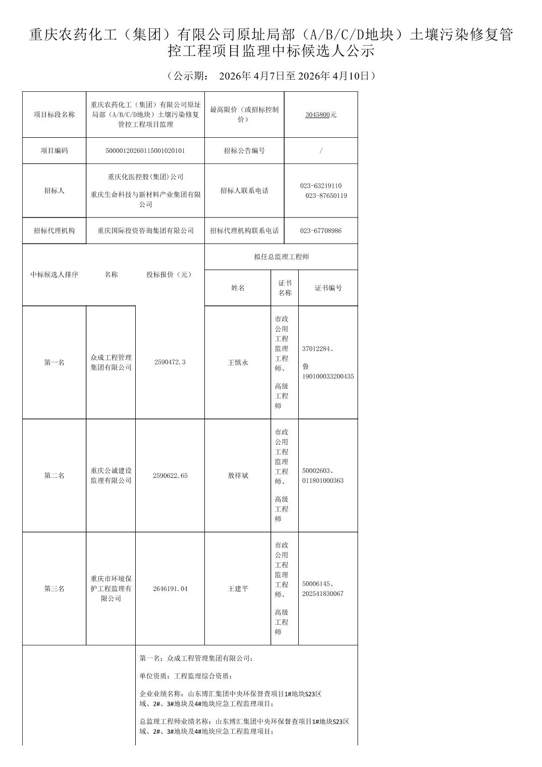 重庆农药化工(集团)有限公司原址局部(A/B/C/D地块)土壤污染修复管控工程项目监理中标候选人公示