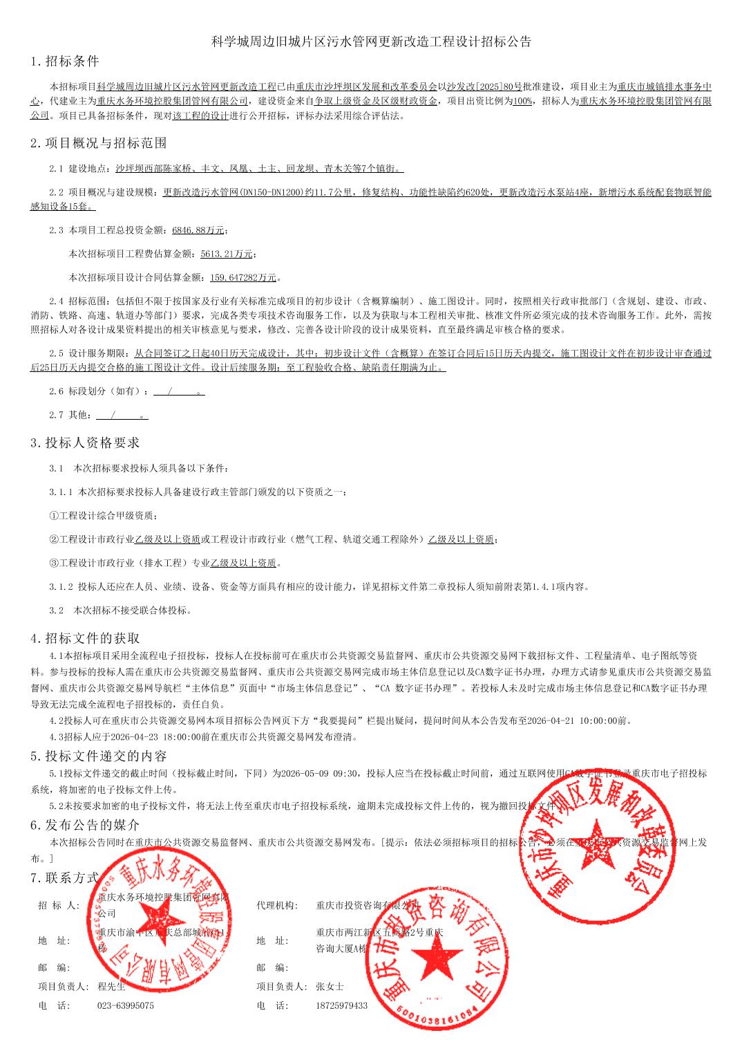 | 名称: | 科学城周边旧城片区污水管网更新改造工程设计招标公告 | ||||