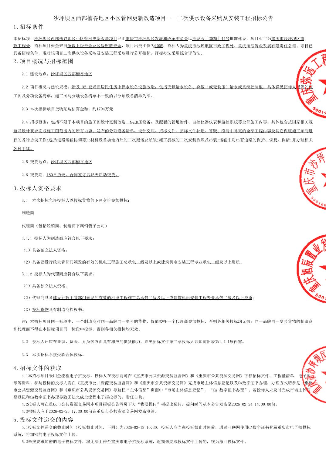 沙坪坝区西部槽谷地区小区管网更新改造项目——二次供水设备采购及安装工程招标公告