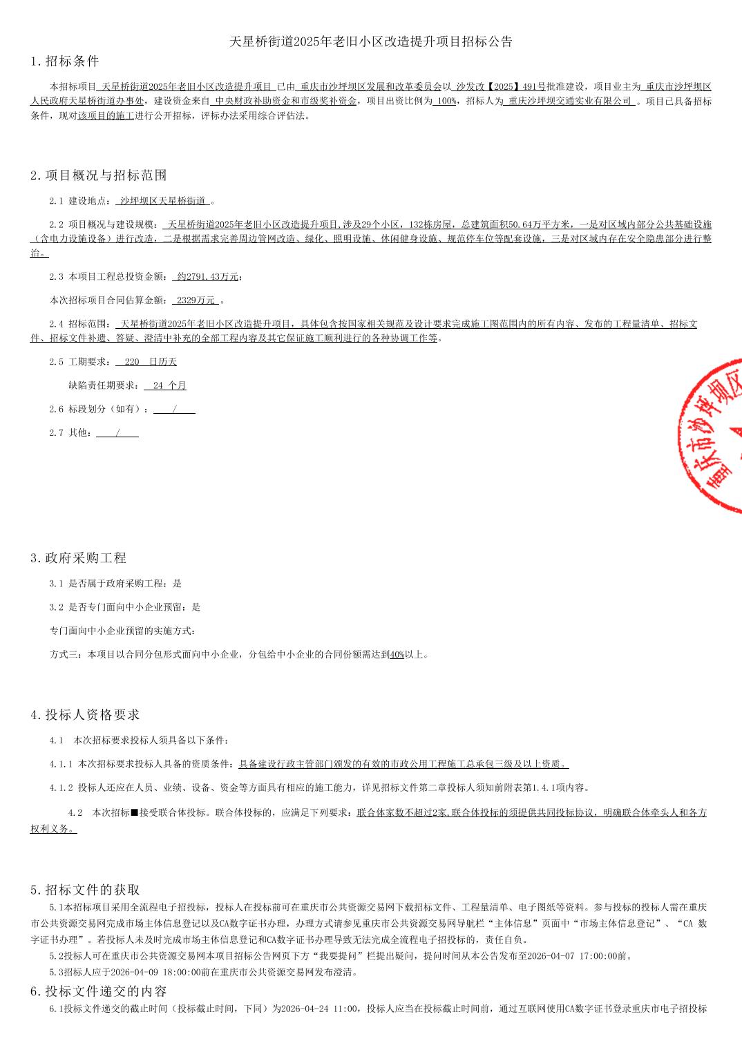 | 名称: | 天星桥街道****年老旧小区改造提升项目招标公告 | ||||