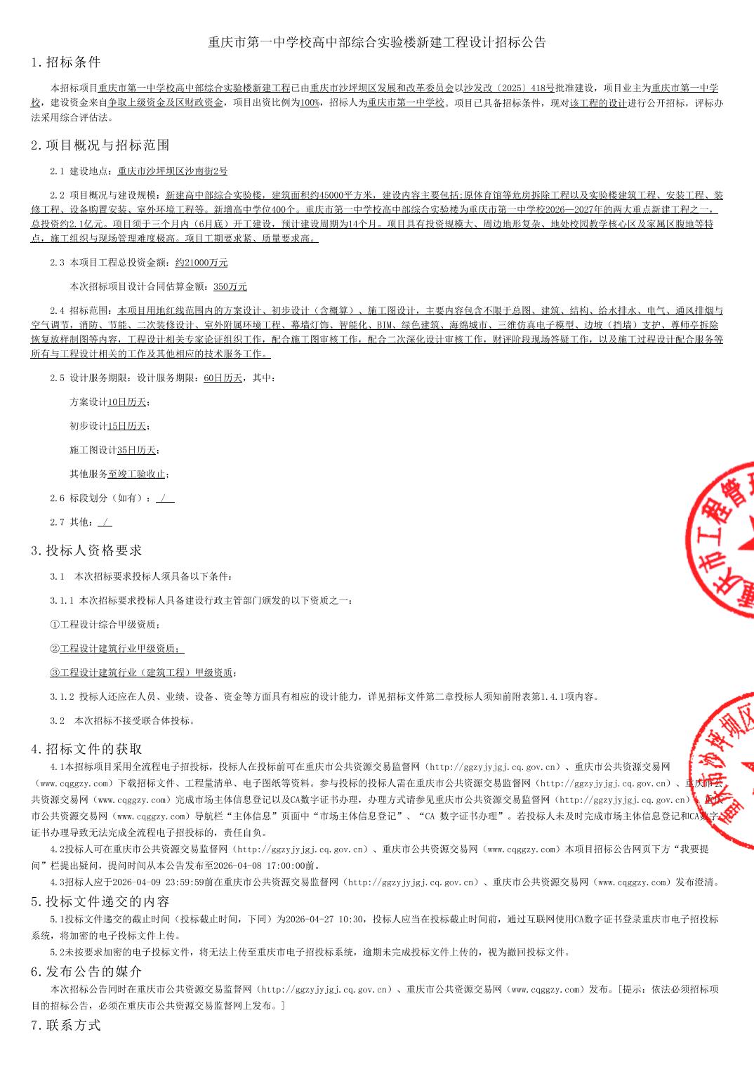 重庆市第一中学校高中部综合实验楼新建工程设计招标公告