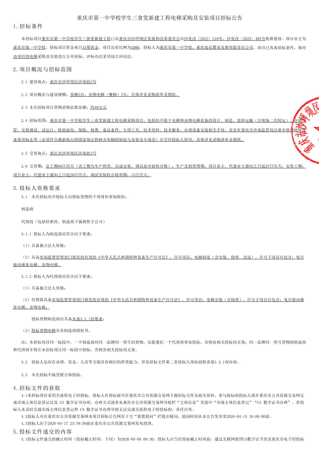 重庆市第一中学校学生三食堂新建工程电梯采购及安装项目招标公告