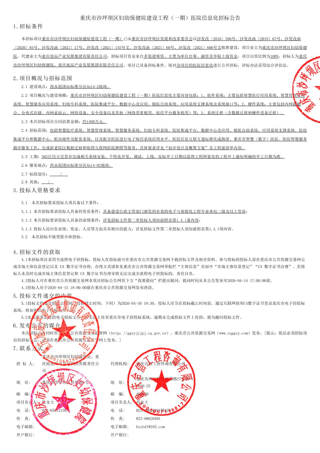 重庆市沙坪坝区妇幼保健院建设工程(一期)医院信息化招标公告