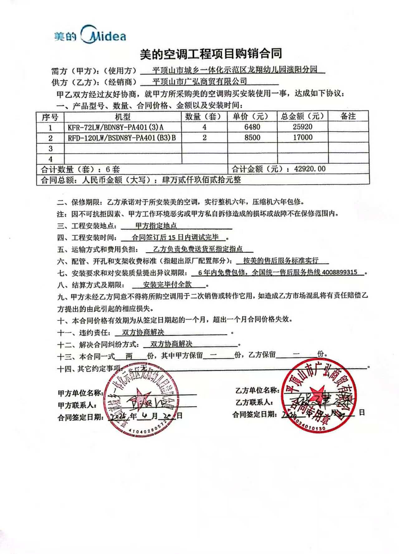 | 二、合同名称:平顶山市城乡一体化示范区龙翔幼儿园滍阳分园空调项目 | ||||||||||||||||||