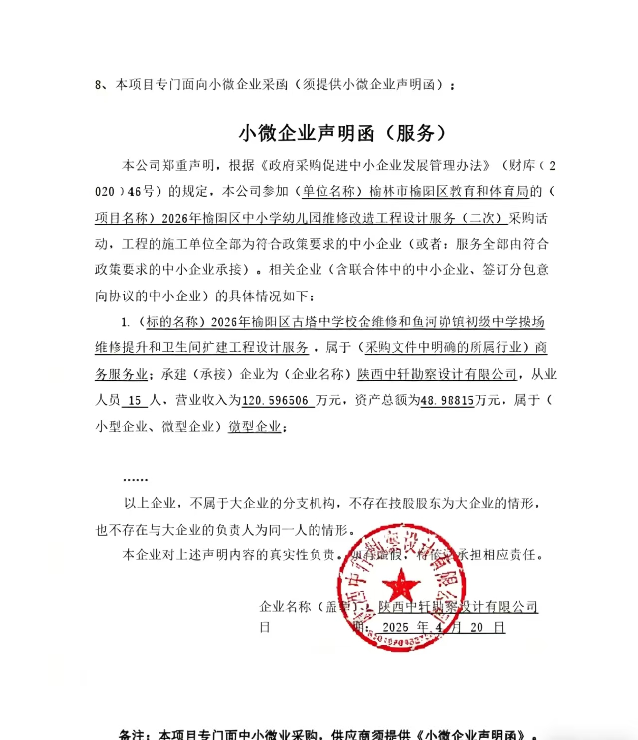 | * | 工程设计服务 | ****年榆阳区古塔中学校舍维修和鱼河峁镇初级中学操场维修提升和卫生间扩建工程设计服务 | 竞争性谈判文件规定内容 | 工程设计服务 | 中标后**天内完成初设代可研及概算,批复后*天内提供施工图纸 | 符合行业标准 | ***,***.** |