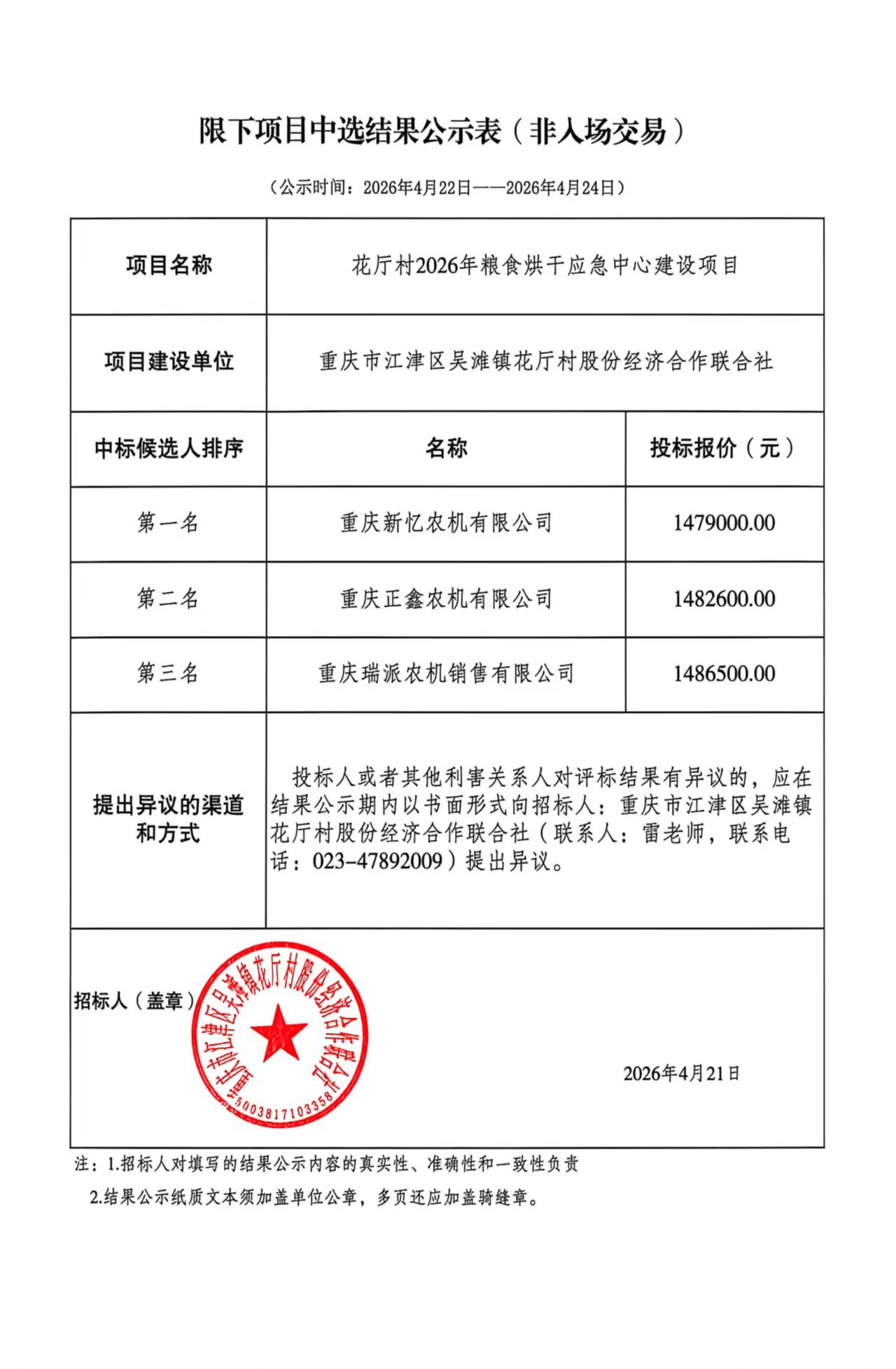 花厅村2026年粮食烘干应急中心建设项目中标结果公示