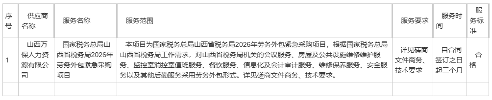 国家税务总局山西省税务局2026年劳务外包紧急采购项目成交公告