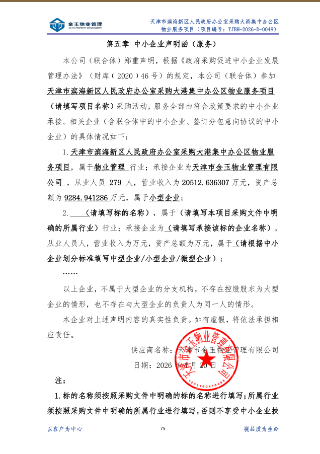 受天津市滨海新区人民政府办公室委托,天津市滨海新区政府采购中心以竞争性磋商方式,对天津市滨海新区人民政府办公室采购大港集中办公区物业服务项目实施采购,现将成交结果公布如下: 一、项目名称和编号 *.项目名称:天津市滨海新区人民政府办公室采购大港集中办公区物业服务项目 *.项目编号:**************** 二、成交信息 *.成交供应商名称:天津市金玉物业管理有限公司 *.成交供应商地址:天津市滨海新区滨海天津生态城中泰大道****号图书档案馆一层***** *.供应商评审报价、评审总得分及排序情况:见附件 *.主要成交标标的名称、规格型号、数量、单价、服务要求或者标的基本概况:见附件 三、磋商小组成员名单 宫宜明、何斌、辛昆(采购人代表) 四、项目联系人及联系方式 *.联系人:刘春雪 *.联系电话:******** 五、采购人的名称、地址和联系方式 *.采购人名称:天津市滨海新区人民政府办公室 *.采购人地址:天津市滨海新区塘沽大连东道****号滨海文化商务中心 *.采购人联系电话:战岩 ******** 六、采购代理机构的名称、地址和联系方式 *.采购代理机构名称:天津市滨海新区政府采购中心 *.采购代理机构地址:天津市滨海新区营口道***号 *.采购代理机构联系方式:************ 七、质疑方式 参与本项目政府采购活动的供应商认为成交结果使自己的合法权益受到损害的,可以在成交结果公告期限届满之日起*个工作日内,以书面形式向采购人天津市滨海新区政府采购中心提出质疑,逾期不予受理。 八、采购人和评审专家推荐意见 九、本项目向成交供应商收取服务费*元。 十、成交结果公告期限 成交结果的公告期限为*个工作日。 十一、竞争性磋商文件公告:见附件