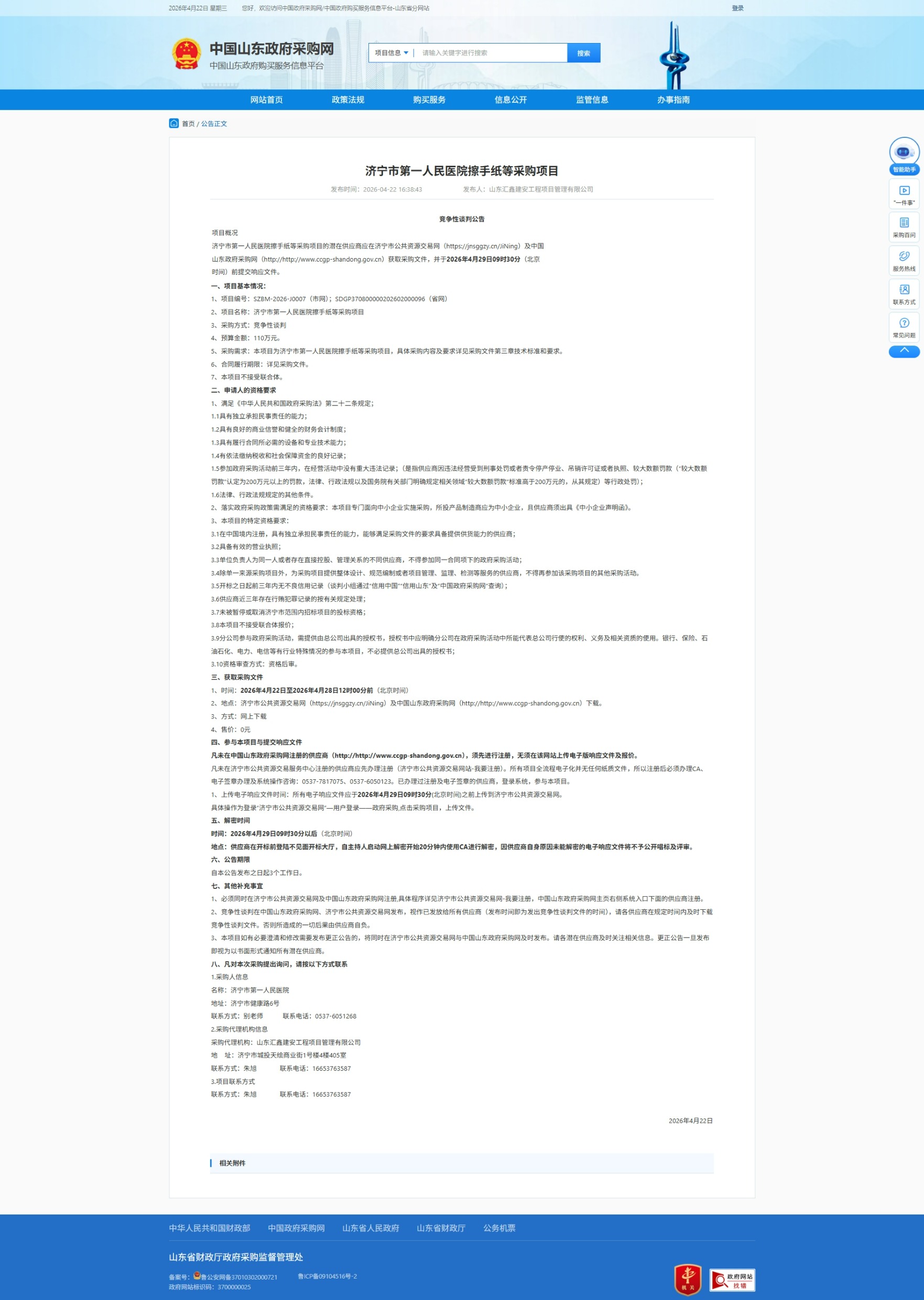 济宁市第一人民医院擦手纸等采购项目竞争性谈判公告