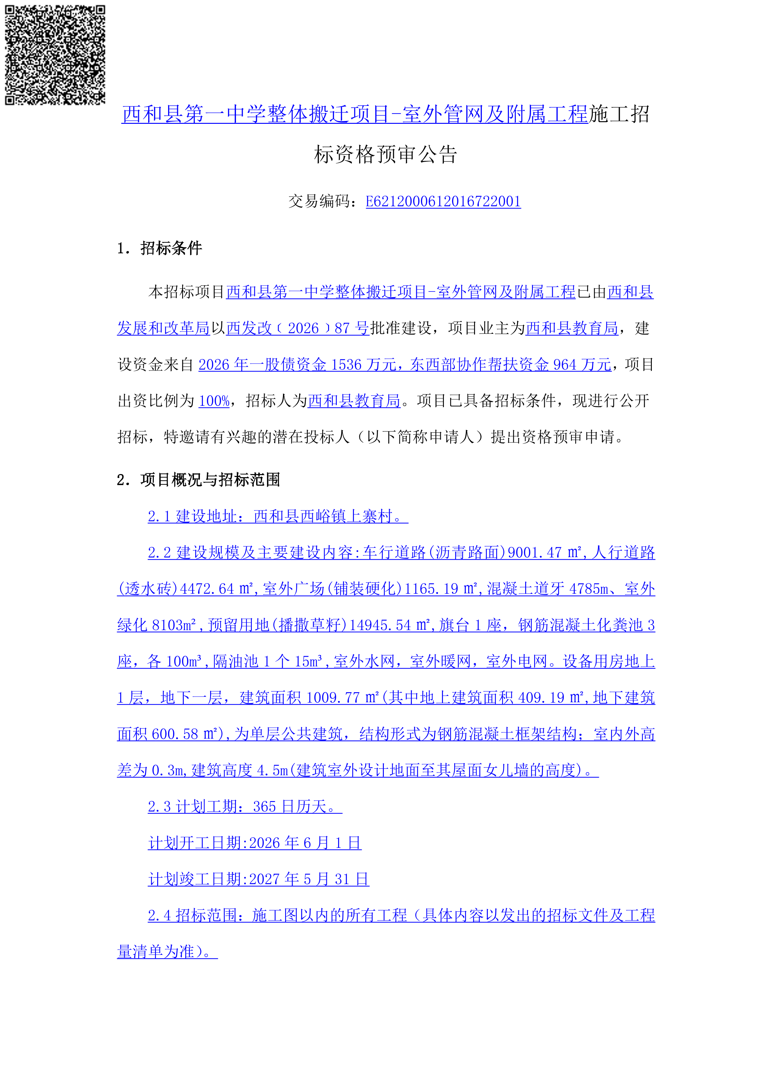 西和县第一中学整体搬迁项目-室外管网及附属工程施工招标资格预审公告[招标/资审公告]