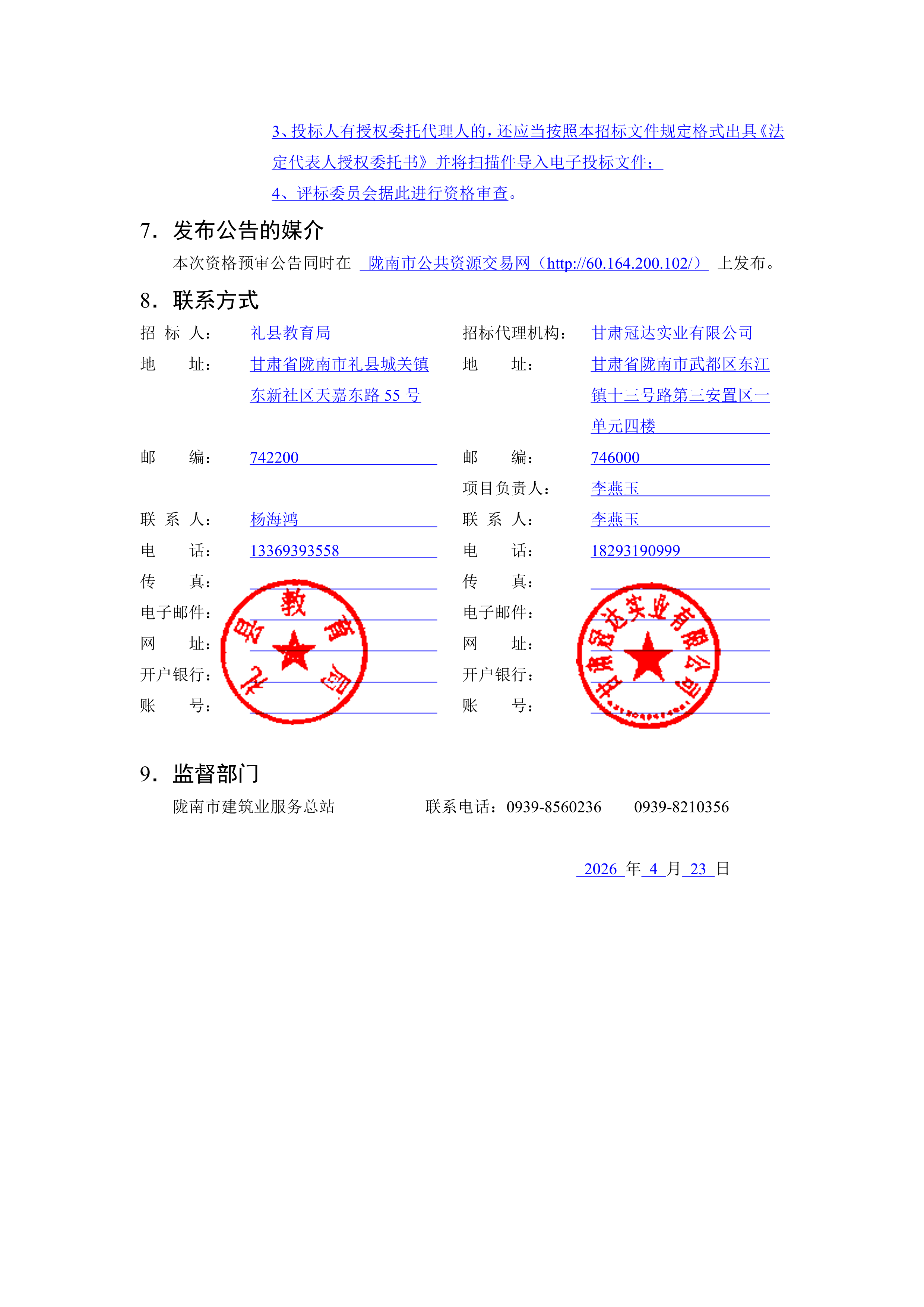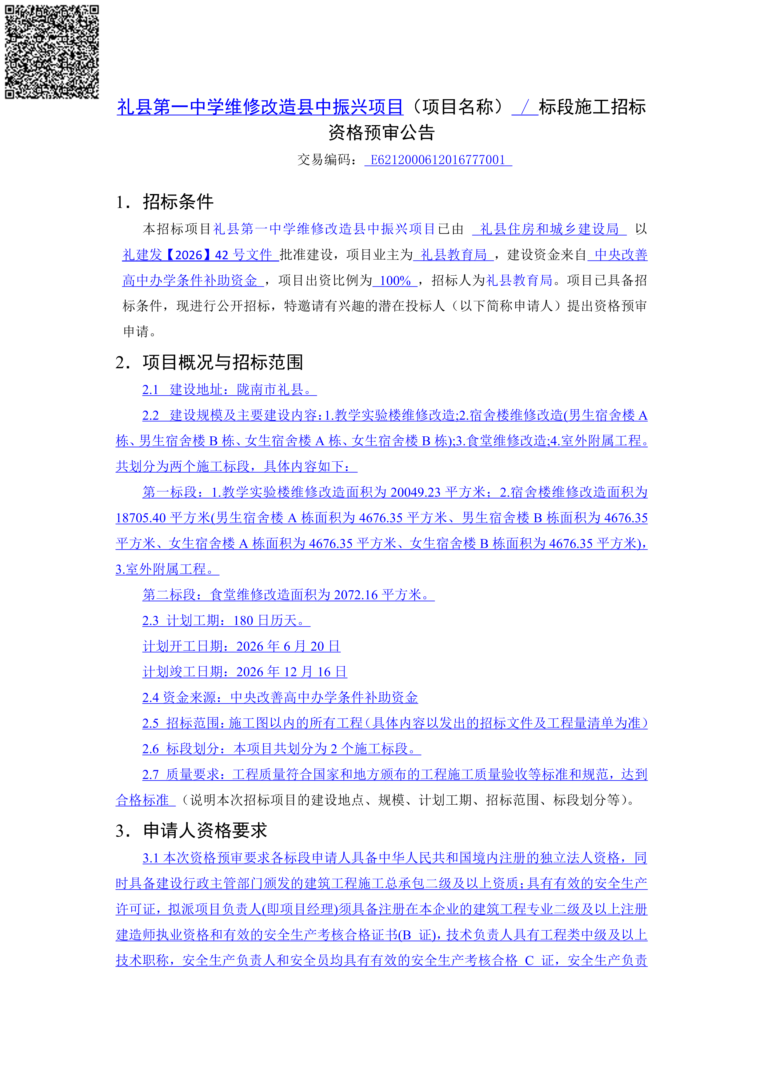 礼县第一中学维修改造县中振兴项目施工招标资格预审公告[招标/资审公告]