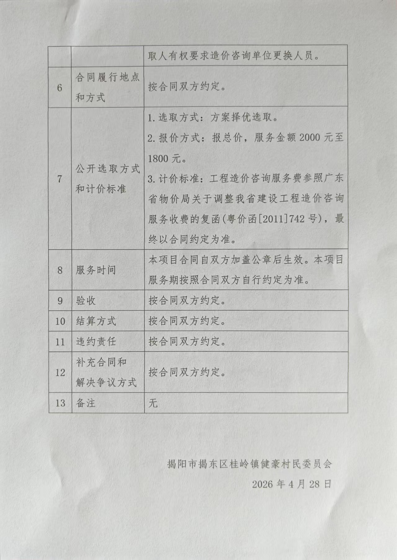 ********** **:** ,在广东省网上中介服务超市为揭阳市揭东区桂岭镇健豪村民委员会 公开选取工程造价咨询中介服务机构,现将相关事项公告如下: