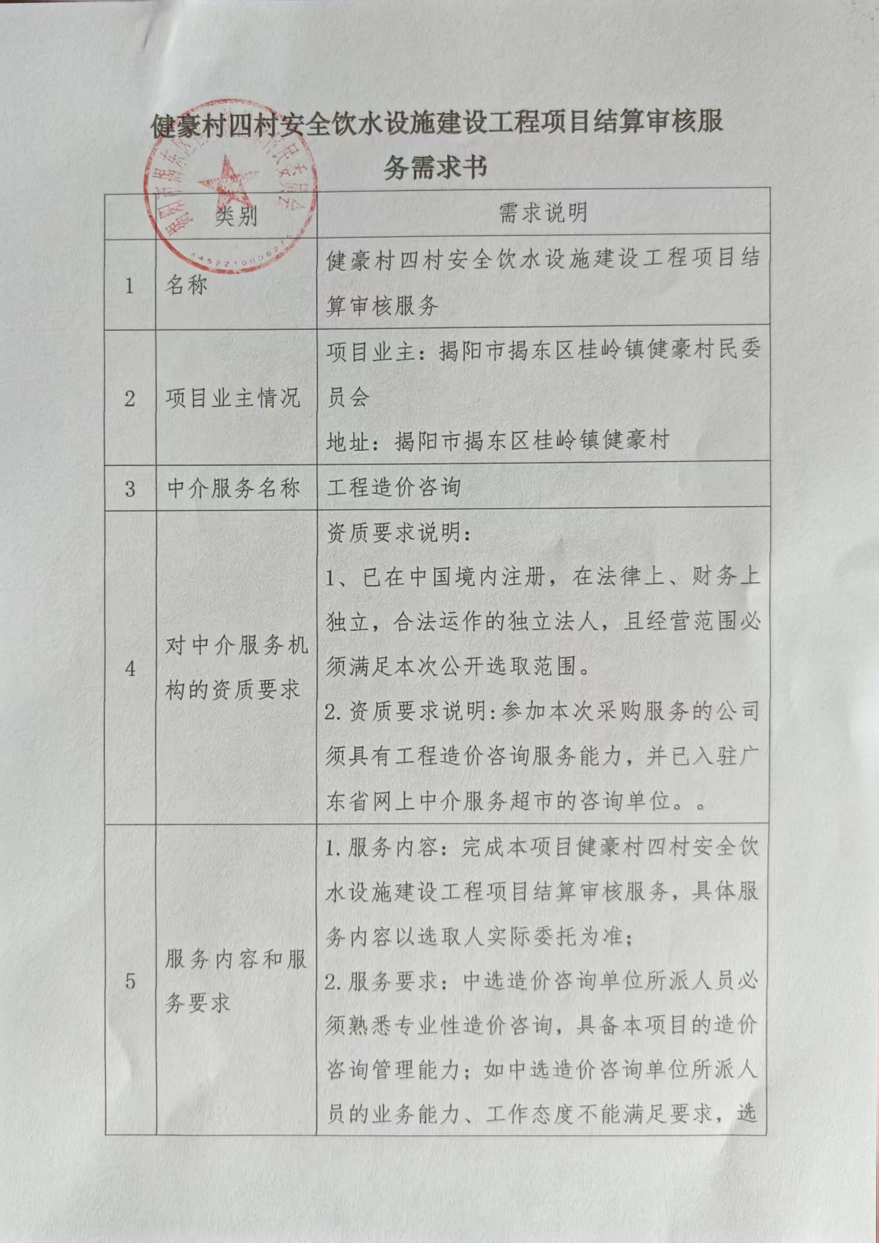 关于为【健豪村四村安全饮水设施建设工程项目结算审核服务】公开选取【工程造价咨询】机构的公告