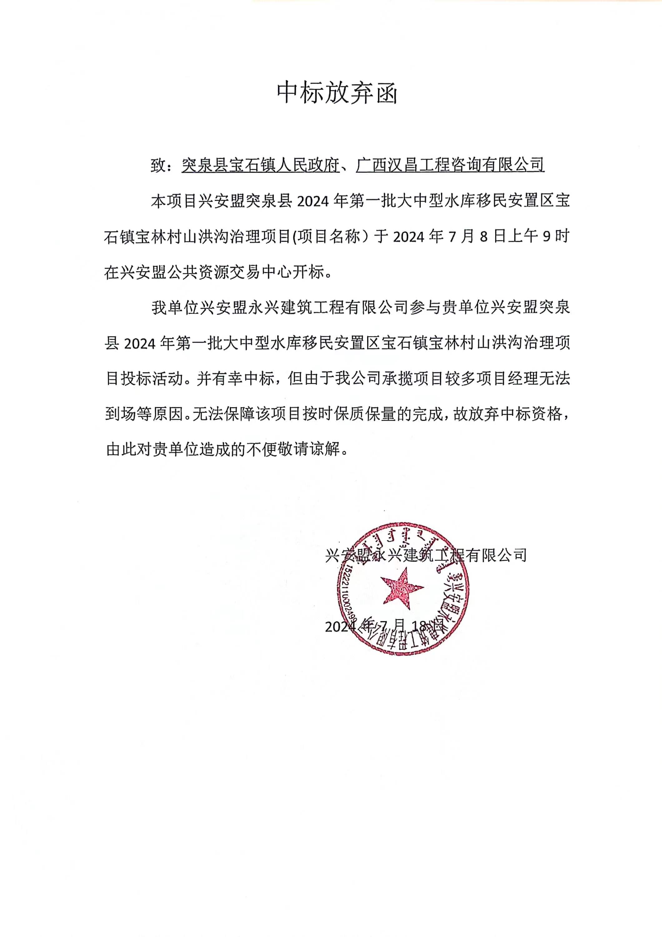 原公告的合同包*(兴安盟突泉县****年第一批大中型水库移民安置区宝石镇宝林村山洪沟治理项)中标状态:中标,更正为:未中标。废标原因为:本单位于****年*月*日*时在兴安盟公共交易中心举行开标会,由于中标单位项目经理无法到场施工该项目,无法保障该项目按时保质保量的完成,放弃中标资格。。