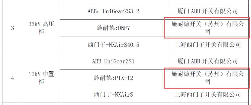 **.请澄清确定:品牌表中(****),施耐德“中置柜”与“高压柜”公司为:施耐德电气(厦门)开关设备有限公司。原”施耐德开关(苏州)有限公司”已关闭、产线搬移,请确认!